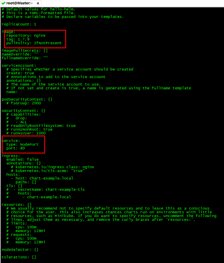 我们通过查看 templates 目录下⾯的 deployment.yaml 文件可以看出默认创建的 Chart 是⼀个 nginx 服务,具体的每个文件是干什么用的,我们可以前往 Helm 官方文档进行查看,当然后面我们也会详细讲解的。比如这里我们来安装 1.7.9 这个版本的 nginx。我们直接更改 value.yaml 文件下面的 image tag 即可,将默认的 stable 更改为 1.7.9,为了测试方便,我们把 Service 的类型也改成 NodePort: