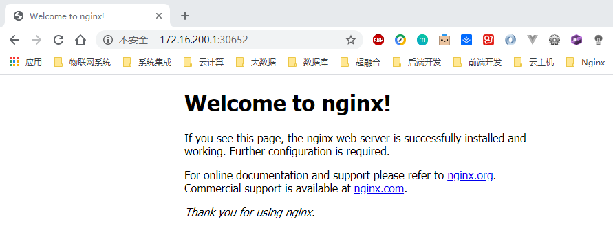 等到 Pod 创建完成后,我们可以根据创建的 Service 的 NodePort 来访问该服务了,然后在浏览器中 打开 http://172.16.200.1:30652 就可以正常的访问我们刚刚部署的 nginx 应用了